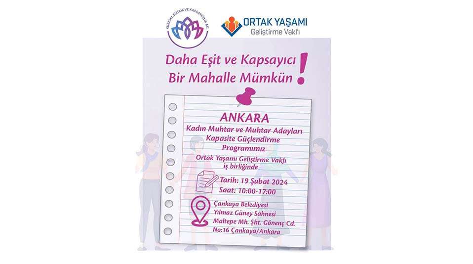 Küresel Eşitlik ve Kapsayıcılık Ağı , yaklaşan yerel seçimler öncesinde mevcut kadın muhtarların yanında olmayı ve aday olmak isteyen kadınları teşvik etmeyi amaçlıyor. Ankara’nın kadın muhtarlarının ve muhtar adaylarının katılacağı kapasite güçlendirme programı 'eşit temsil' ve 'eşit katılım' temasıyla gerçekleştirilecek.
