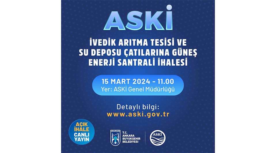 İvedik Pompa İstasyonu Çatı Tipi Güneş Enerjisi Santrali Yapım İşi ihalesi, 15 Mart 2024 tarihinde saat 11.00’de ASKİ Genel Müdürlüğü’nde gerçekleştirilecek. İhaleye katılmak isteyen firmalar https://aski.gov.tr/tr/IhaleDetay.aspx?ID=3470 adresi üzerinden ihale detaylarına ve katılım şartlarına ulaşabilecek.